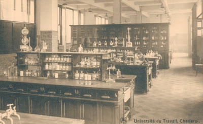 20世纪20年代沙勒罗瓦劳动大学化学实验室图片。