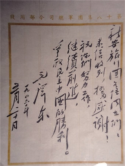 至1946年,新旅团员已经发展到100多人。这年年初,党中央决定召开全国解放区人民代表大会,新旅顾问汪达之被邀作为代表赴延安开会,由于国共内战全面爆发,中途折返。新旅的同志们为了表达对党的深厚感激之情,写了一封信向毛主席汇报了从国统区到解放区五年来的工作学习生活情况,表示在党的领导下坚持革命斗争的信心与决心,托赴延安开会的张鼎丞、邓子恢、谭震林等同志面交毛主席。5月20日毛主席复信:“来信收到,极为感谢!祝你们努力工作,继续前进,争取民主中国的胜利。”邓子恢将这封信带回交给新旅时,全团特地召集大会,大家噙着热泪听读完了来信,衷心感谢伟大的领袖、伟大的党。