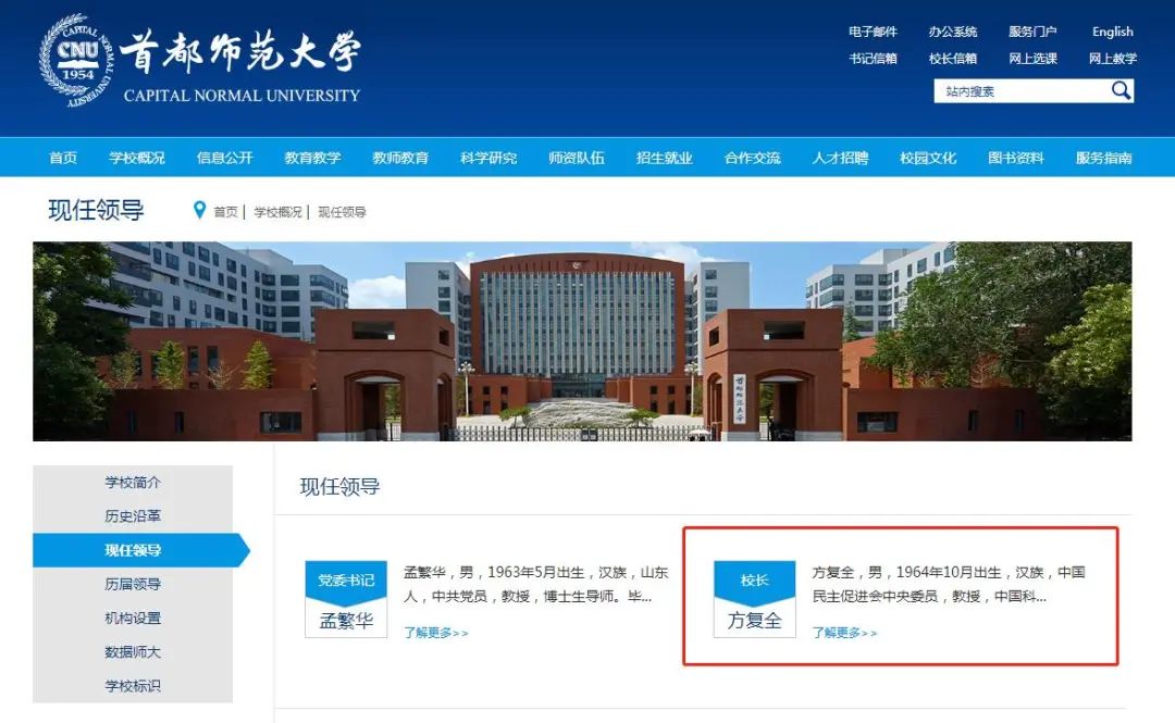 9月23日,首都师范大学召开干部大会,宣布中共北京市委、市政府关于学校校长任免的决定。方复全同志任首都师范大学校长,孟繁华同志不再担任首都师范大学校长职务。首都师范大学官网“现任领导”栏信息也于近日作了更新。