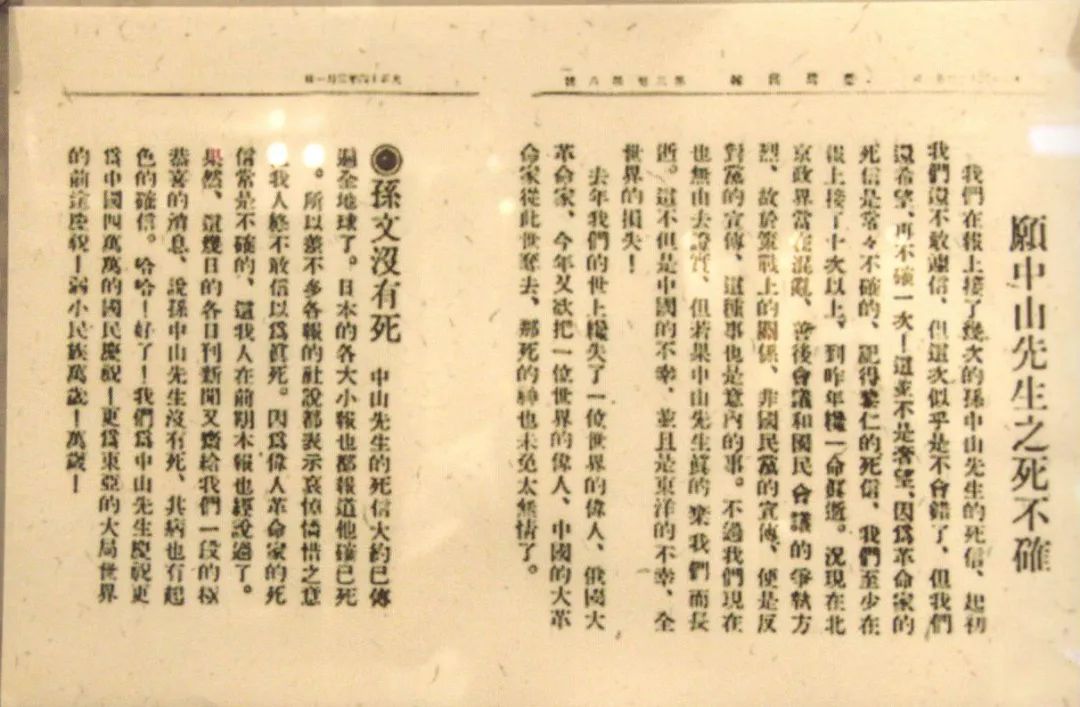 1925年病危之际,孙中山先生仍念念不忘台湾同胞。这时期,一度传出孙中山先生与世长辞的不确消息。深切关注他病情的台湾同胞将信将疑,不愿接受这个事实。1925年2月21日,《台湾民报》刊登《愿中山先生之死不确》一文,真切地反映了他们当时的心情:“我们在报上接了几次的孙中山先生的死信,起初我们还不敢相信,但这次似乎是不会错了,但我们还是希望,再不确一次!”他们认为,“但若果中山先生真的弃我们而长逝。这不仅是中国的不幸,并且是东洋的不幸,全世界的损失”。当听到孙中山先生还活着时,3月1日《台湾民报》又刊登了《孙文没有死》一文,欣喜地指出:“这几日的各日(本)刊新闻又带给我们一段的极恭喜的消息,说孙中山先生没有死。其病也有起色的确信。哈哈!好了!我们为孙中山先生庆祝。”