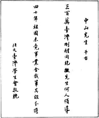 除此之外,散居在祖国大陆的台湾同胞也通过各种方式进行悼念。在北京大学就读的洪炎秋等台湾学生写下挽联:“三百万台湾刚醒同胞,微先生何人领导?四十年祖国未竟事业,舍我辈其谁分担!”表达了悲痛心情及继承孙中山遗志的决心。