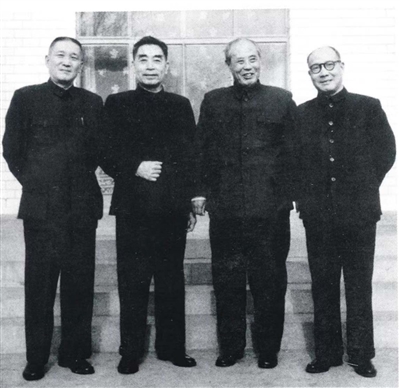 一九六二年春节前夕,周恩来邀请屈武(右一)、张治中(左一)、 傅作义(右二)共商国共第三次合作大计。