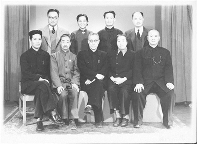 一九四九年九月,参加全国政协第一届全体会议的民进代表合影。前排左起:林汉达、周建人、马叙伦、许广平、王绍鏊,后排左起:梅达君、雷洁琼、徐伯昕、严景耀。