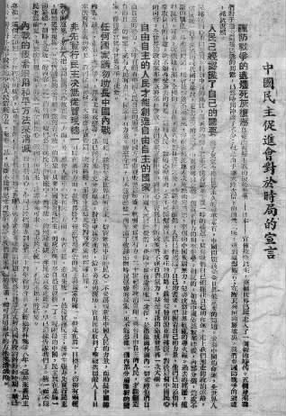 这份宣言,即民进成立之后的第一个宣言也是民进在民主革命时期的纲领性文件——《中国民主促进会对于时局的宣言》(以下简称《宣言》)。《宣言》里第五段讨论民主和统一的关系: