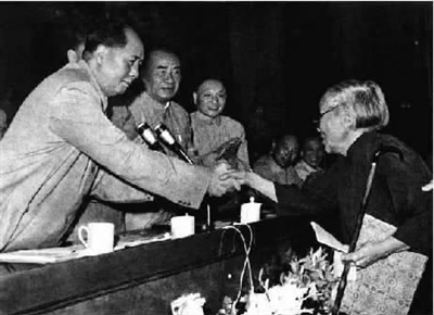 1961年,在庆祝中国共产党成立40周年大会上,毛泽东与何香凝亲切握手。