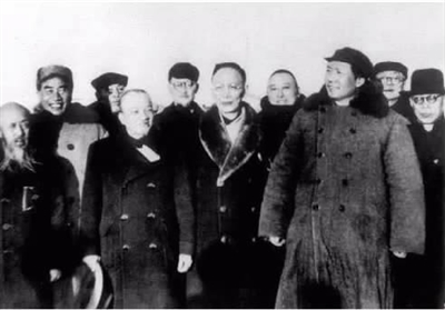 1949年3月25日,刚进入北平的毛泽东与北平各界人士合影。左起第四为李济深。