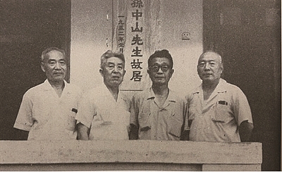 1977年夏,郑洞国(左二)、侯镜如(左一)、杜聿明(右二)、宋希濂(右一)合影于广州黄埔军校孙中山故居前。