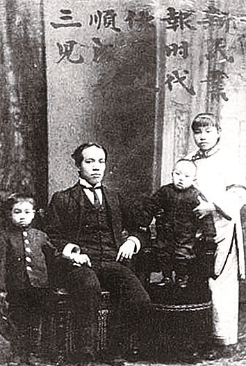 1905年,梁启超与长女思顺、二子思成、三子思永在日本东京。