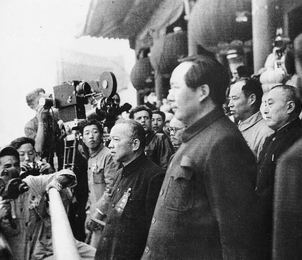 1949年10月1日,毛泽东(右一)与李济深(右二)等在天安门城楼上出席开国大典。