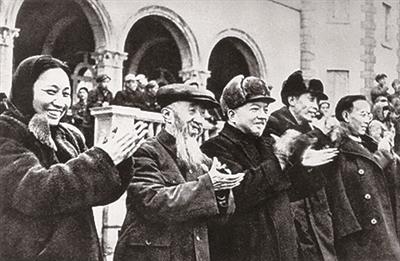 1949年1月,李济深(左三)、沈钧儒(左二)、郭沫若(右一)等人到达沈阳,受到中共及各界人士的热烈欢迎。图为李济深等人观看演出。