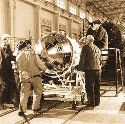 一九七〇年初,科研人员正在厂房内测试东方红一号卫星。在展览会举办十二年后,中国第一颗人造卫星发射成功。