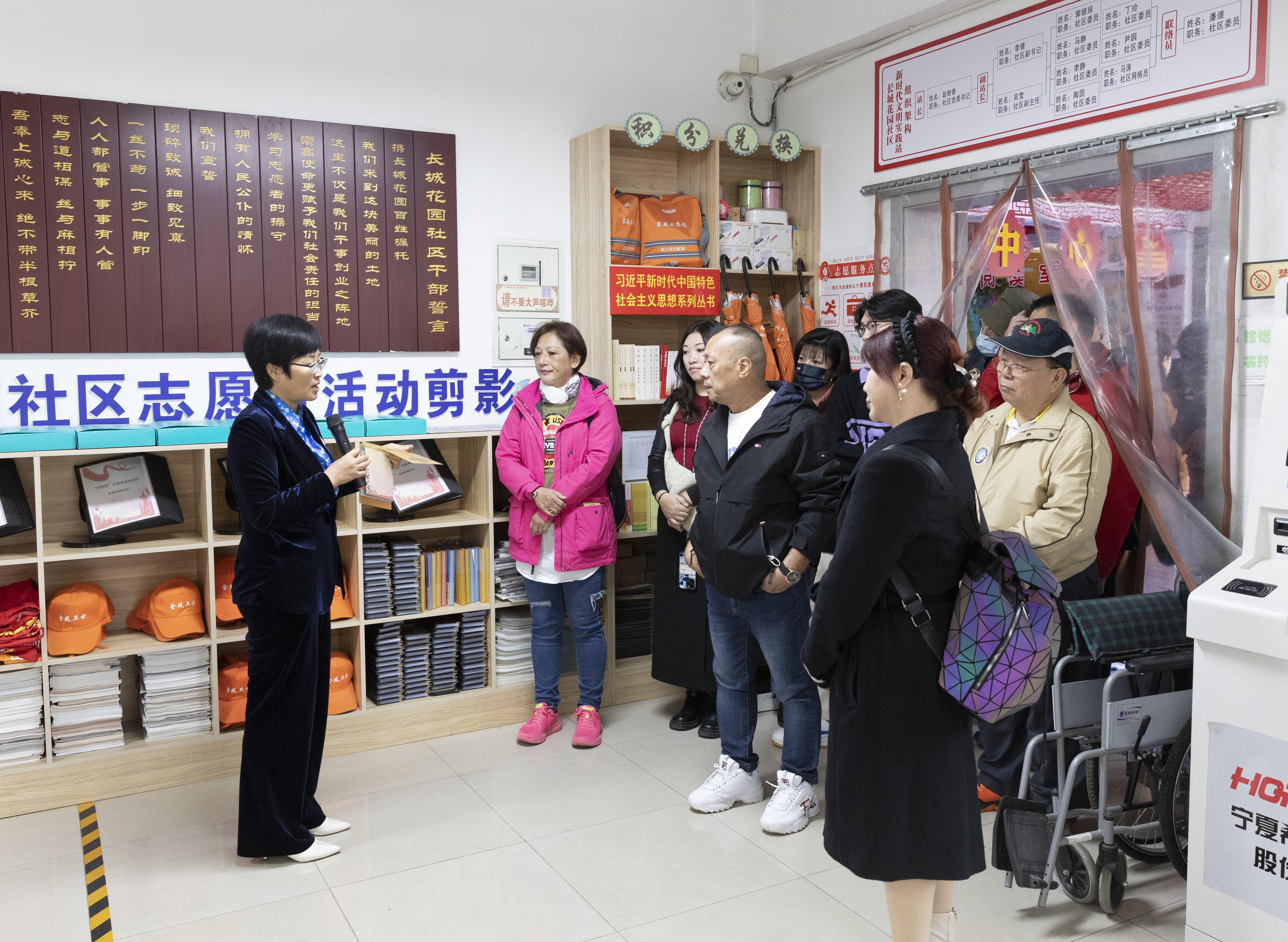 由宁夏港澳台办举办的“宁台社区牵手”交流活动于10月10日至16日举行,活动邀请30位台湾社区里长及社区发展协会理事长、总干事、理事走进宁夏,了解宁夏在社区建设、乡村振兴、特色产业等领域的发展情况。10月12日,“宁台社区牵手”交流活动参访团一行先后走进银川市宝湖社区、长城花园社区,亲身感受大陆社区居民的生活氛围。图为参访团了解长城花园的社区管理模式。(杨 迪 摄影报道)
