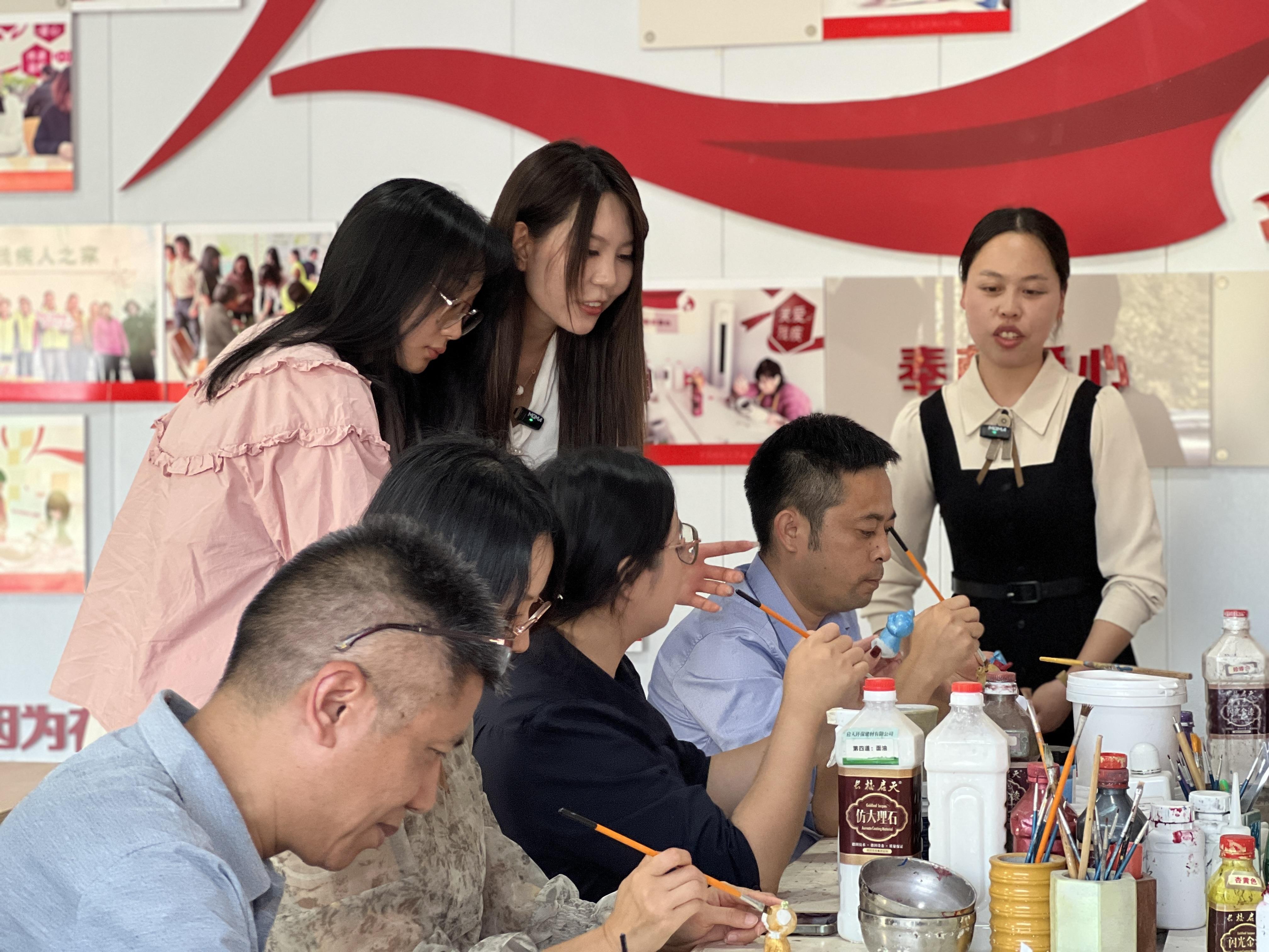 民建新吴区二支部的会员们积极参与直播项目体验,用上色笔给一个个摆件、花盆穿上五彩斑斓的新衣,成为了可供残友义卖的工艺成品。