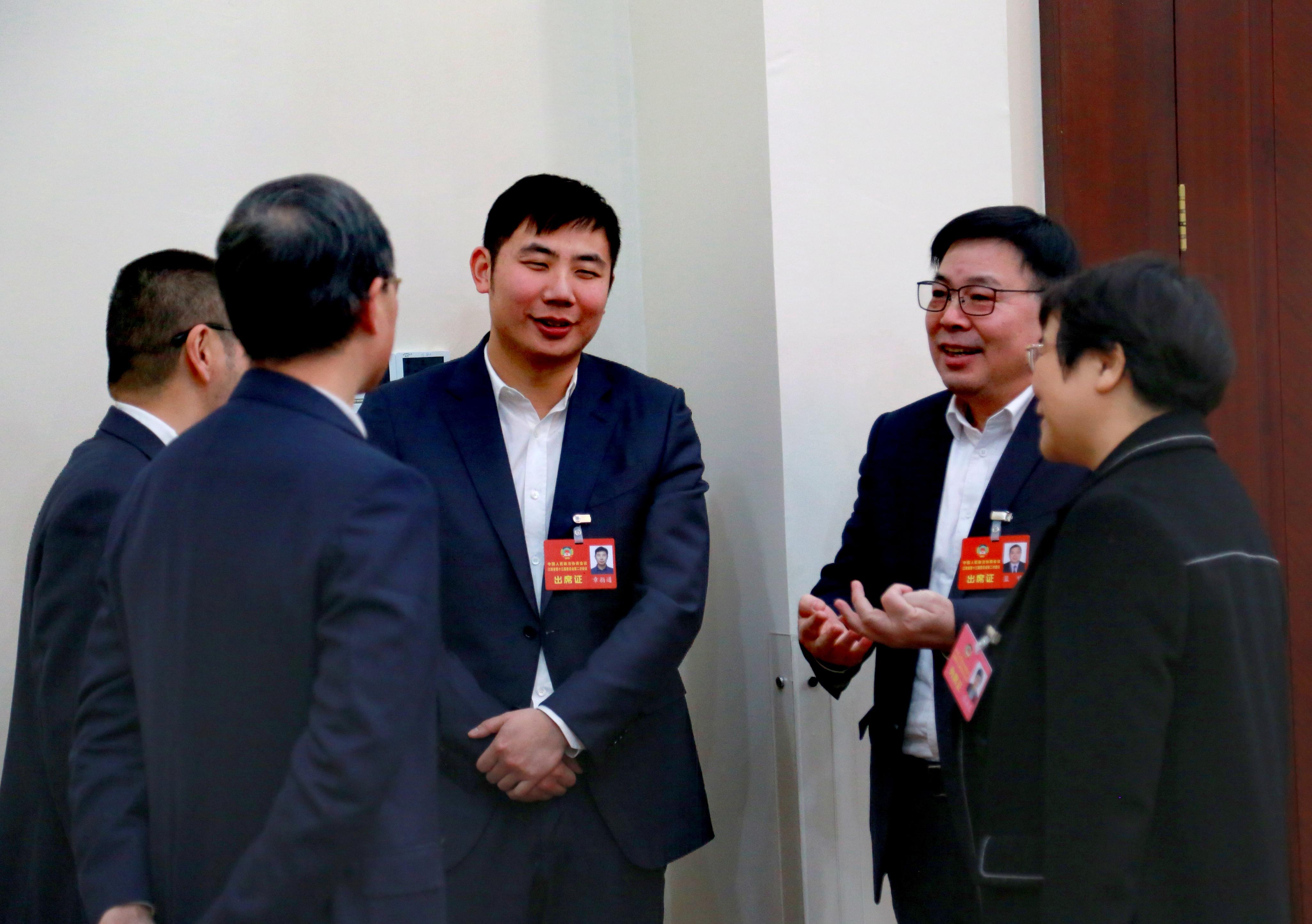 1月23日,江西省政协十三届二次会议小组讨论间隙,民革界委员蓝赟(右二)、章指通(中)等就共同关注的教育话题交流意见和建议。记者 周福志 摄