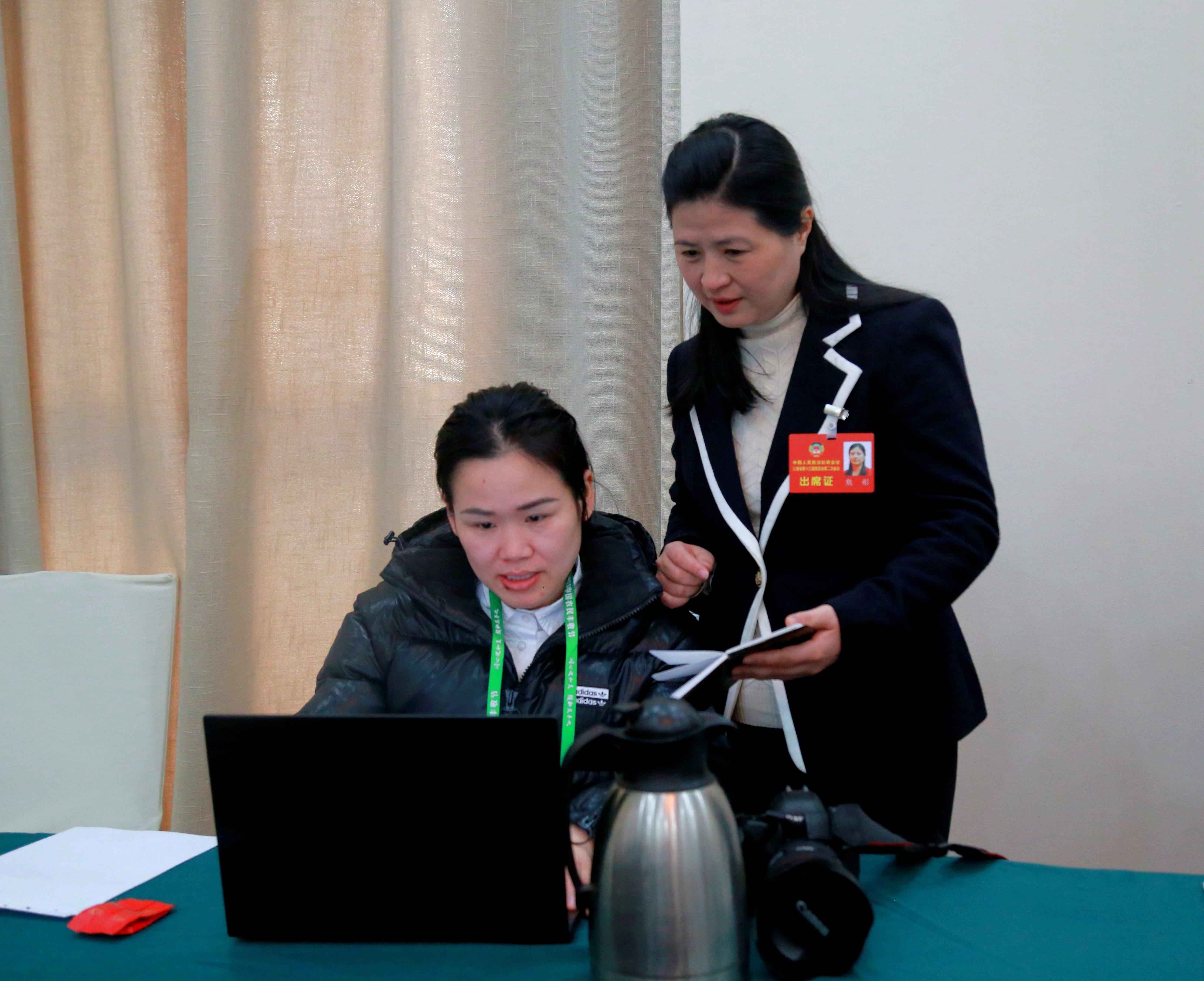 1月23日,江西省政协十三届二次会议小组讨论间隙,民革江西省委会副主委熊彤(右)就会议发言记录与工作人员交流。 记者 周福志 摄