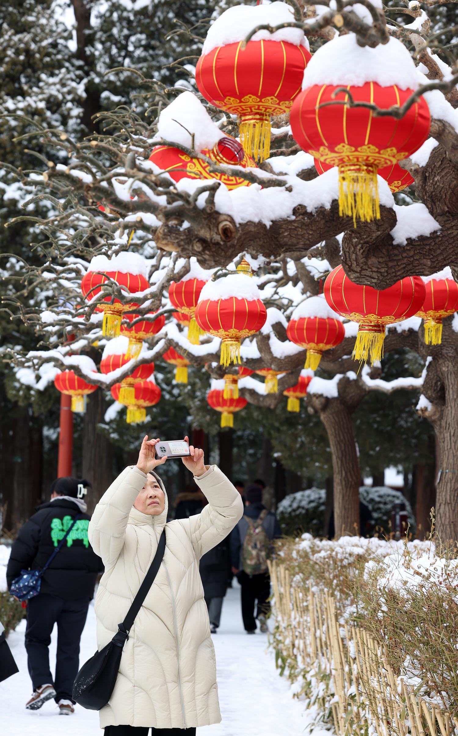 雪后的景山公园节日红灯笼吸引市民驻足拍照。