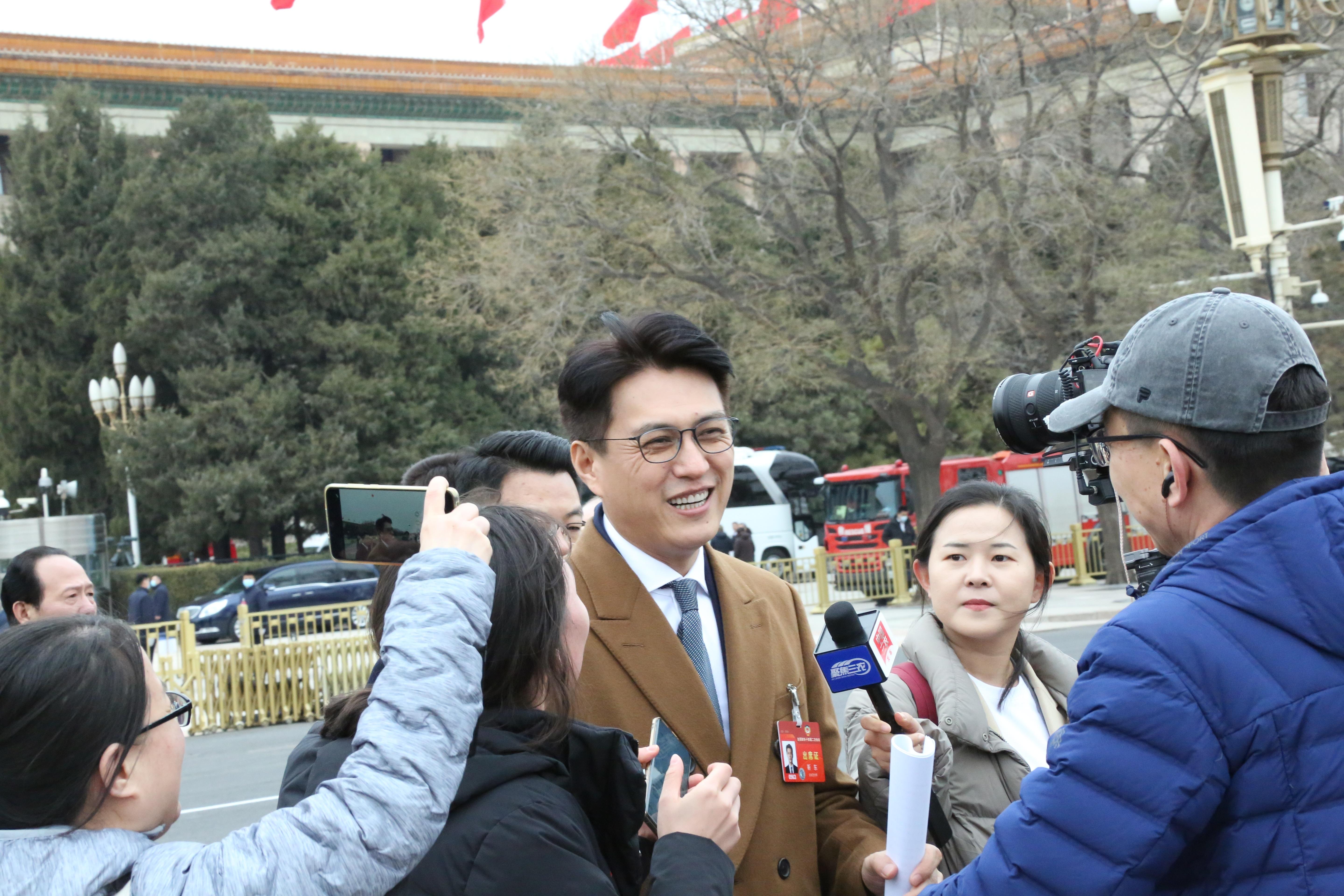 3月4日,全国政协委员、民盟北京市委会副主委靳东在人民大会堂外接受媒体记者采访。 本报记者 靳祖保 摄
