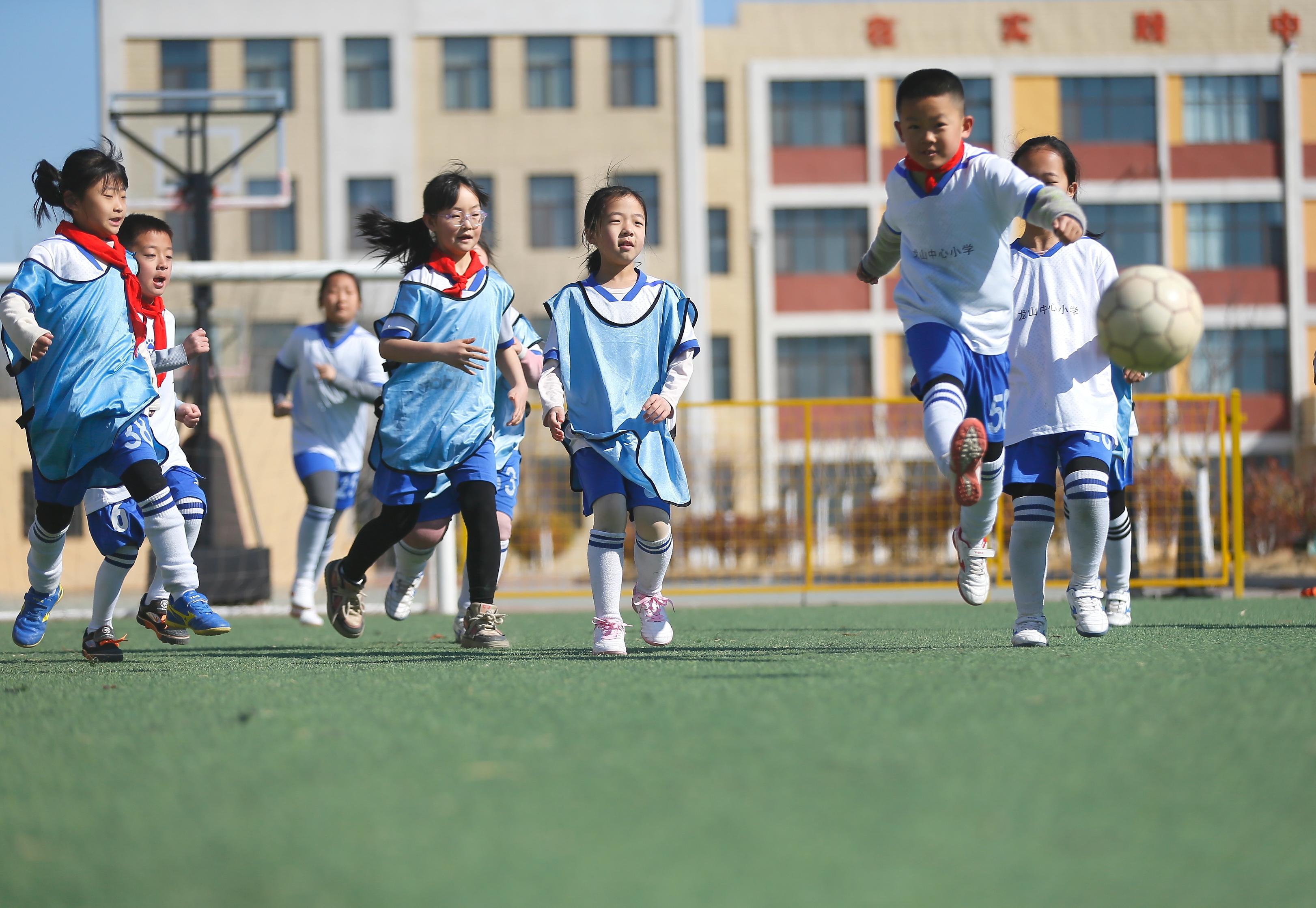 图为3月20日,山东省青岛市即墨区龙山中心小学的学生进行足球对抗赛。