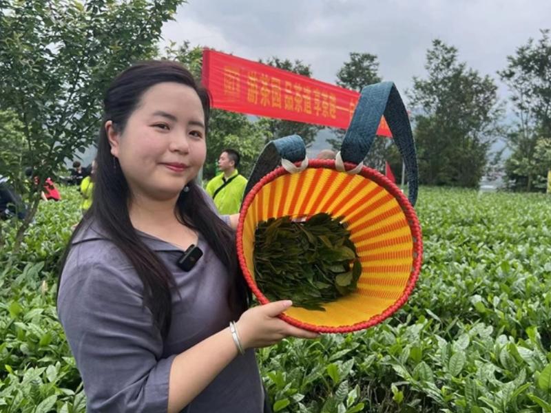 来自宝岛台湾的高级茶艺师吴冠颖向记者展示她采摘的茶叶。