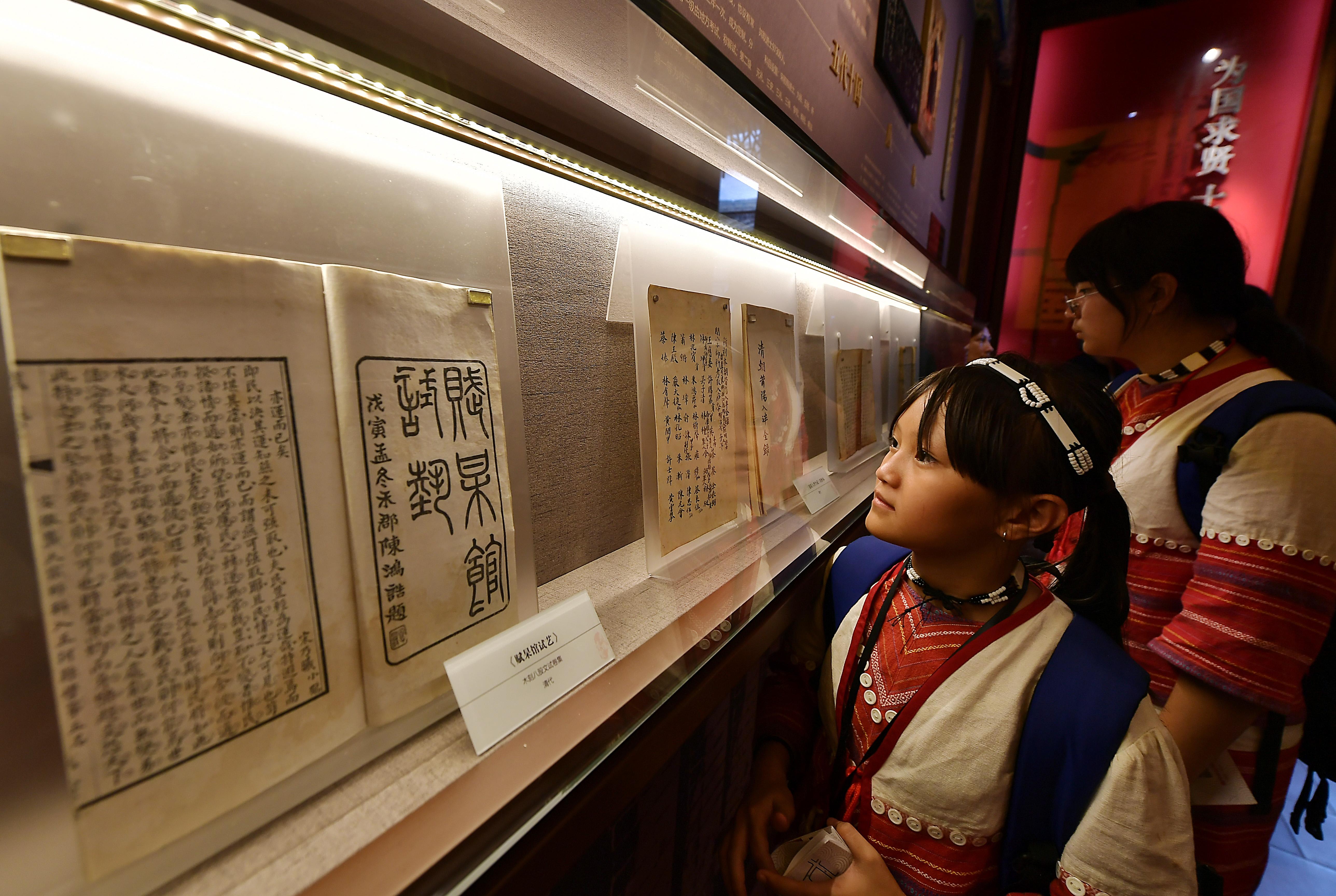 5月7日,台湾宜兰县南澳乡金岳小学的学生在福建省福州台湾会馆参观了解科举文化。当日,“童心同行筑梦未来”榕台青少年交流营活动在福州举行,来自台湾宜兰县的多名学生参与活动。 (张斌)