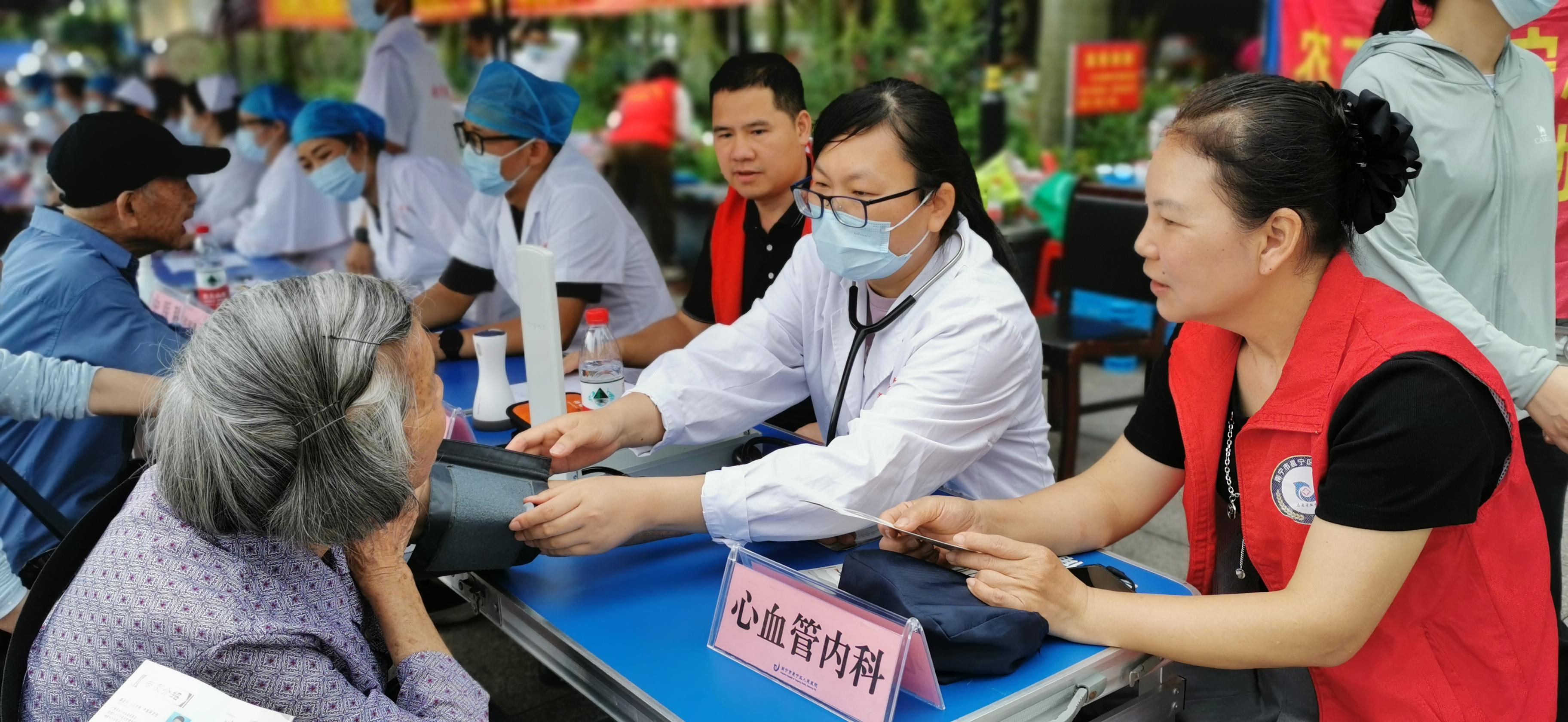 为弘扬南丁格尔精神、迎接第113个国际护士节的到来,5月7日,农工党广西南宁市邕宁区总支组织邕宁区人民医院支部、医卫支部和综合支部的医护党员及党员志愿者,在邕宁区新兴广场开展公益义诊活动。来自心血管内科、糖尿病及康复专科等专家向前来问诊的群众询问病史,耐心解答问题。活动为1000余名居民提供了测量血压血糖、健康咨询和义诊服务。图为农工党党员们在为群众测量血压。