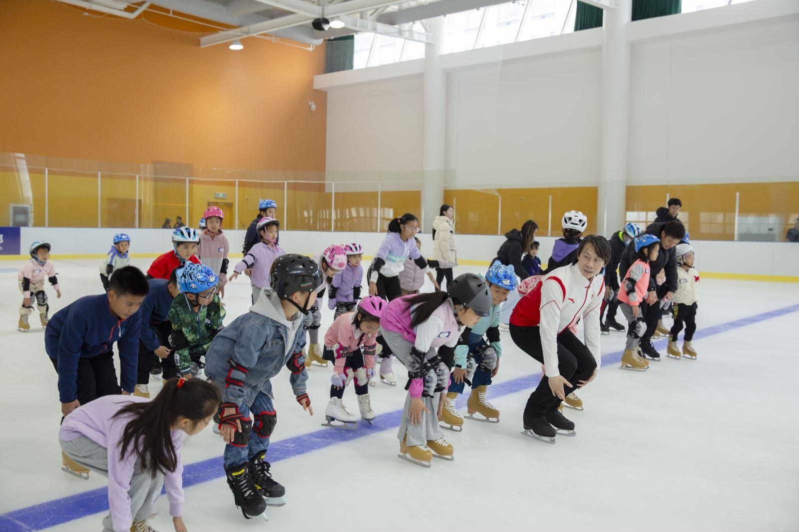 民革北京市委会文卫体委员会副主任、花样滑冰世界冠军佟建在与青少年花滑爱好者交流互动。