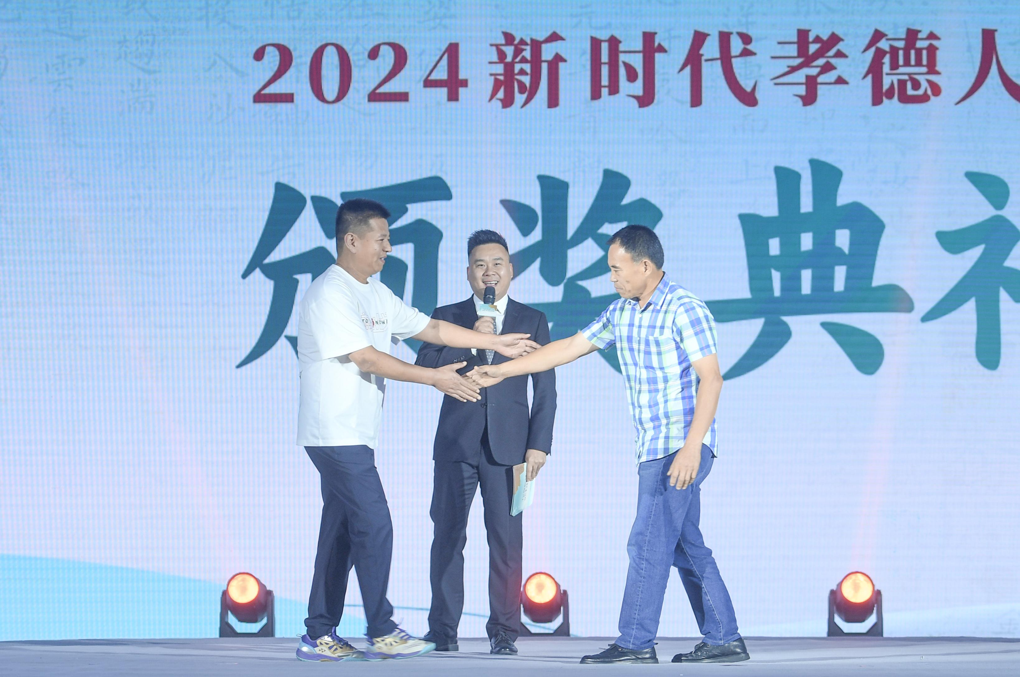 5月23日,在浙江绍兴举行的2024中国·绍兴(上虞)孝文化活动周上,同时获评“2024新时代孝德人物”的刘德文和孙春龙在舞台上握手。