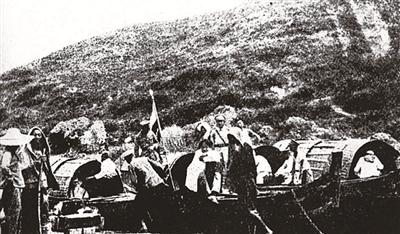 1925年,湖南郴州江边停靠着数条舢板船,黄埔军校的同学正在做宣传工作。
