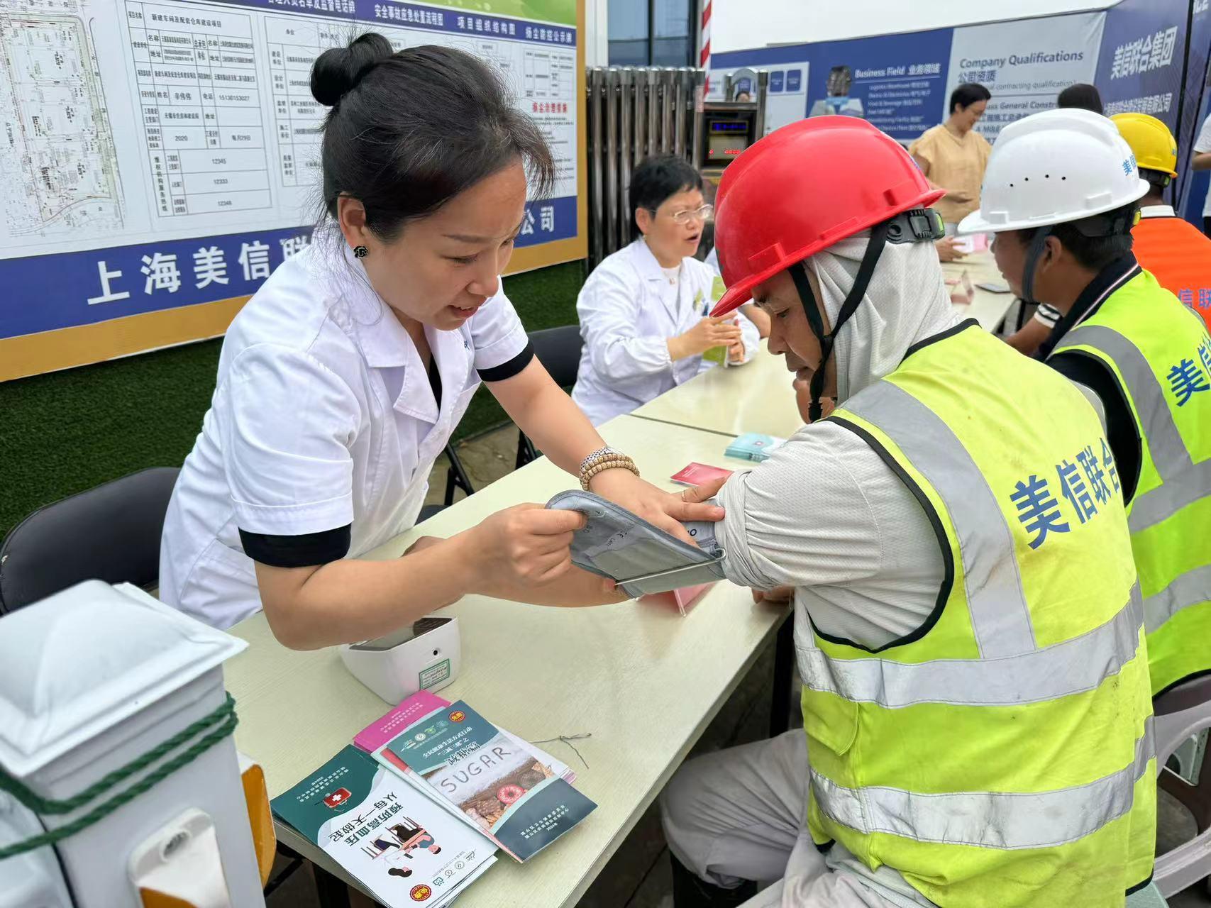 6月23日,农工党江苏省无锡市锡山基层委员会卫生二支部、综合一支部、综合二支部党员赴某企业新建车间及配套仓库建设项目工地,联合开展以“关爱农民工健康伴你行”为主题的社会实践活动。图为农工党党员医师们为工人义诊。(李娥)