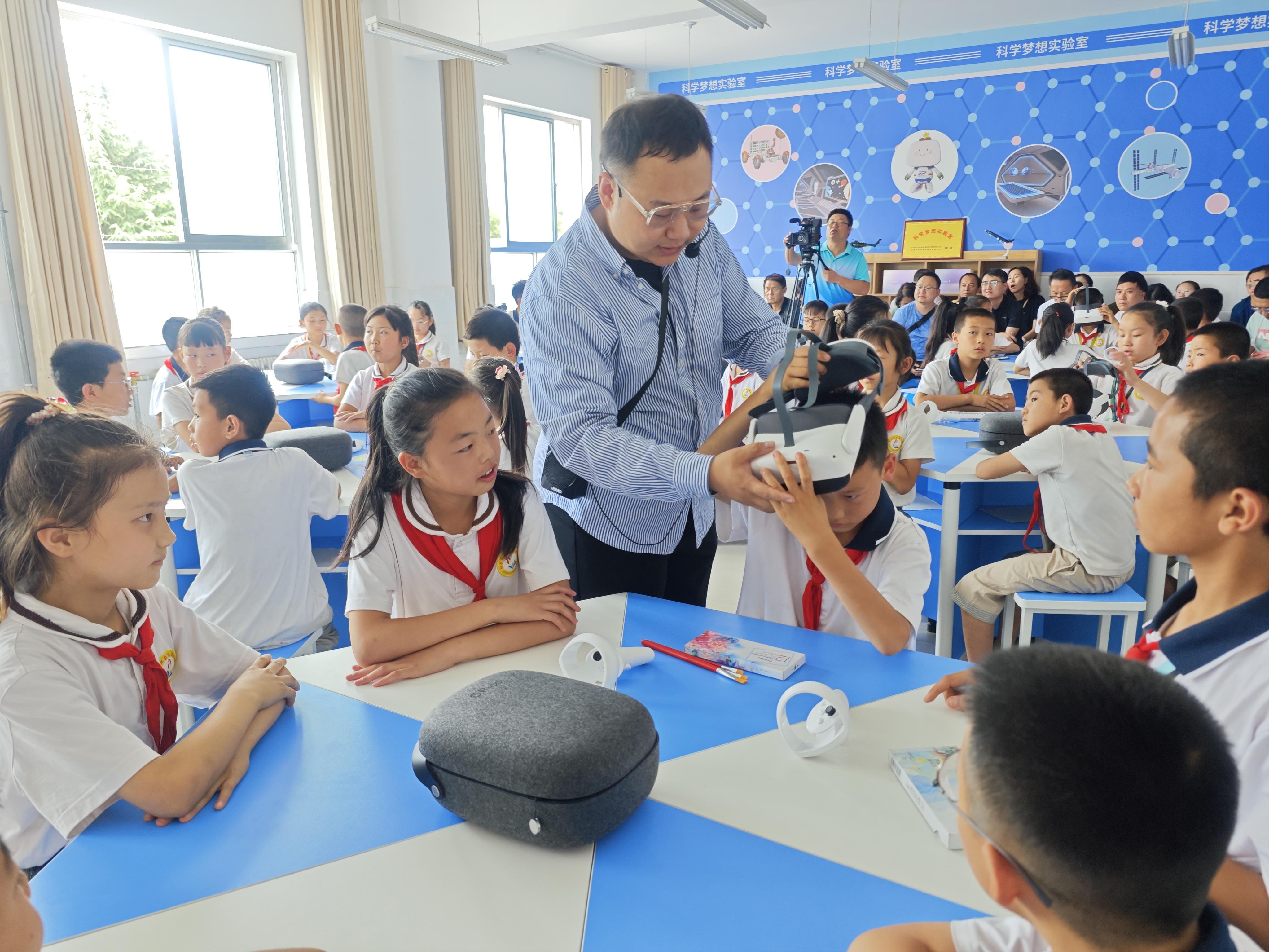 日前,在民进天津市委会的协调推动下,一间科学梦想实验室在甘肃省庆阳市合水县乐蟠小学正式落成,并正式启动首堂VR科学实践课——“神奇的造纸术”。科学梦想实验室以科学教育为目标,配置8台VR眼镜,希望学生在相关课程的学习中“沉浸式”体验科学的魅力,从而走近科学、感受科学、爱上科学。图为课堂上,学生正在教师的指导下佩戴VR眼镜。(津进轩)