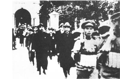1924年,国民党一大在广州召开。共产党人李大钊、林伯渠、瞿秋白、毛泽东等出席了大会。图为孙中山先生步出会场。