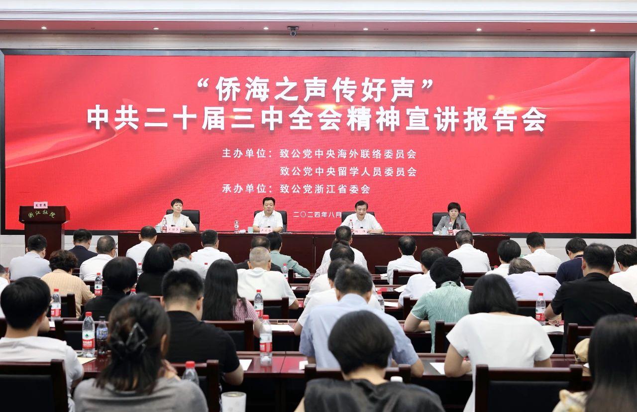 8月24日,由致公党中央海外联络委员会、致公党中央留学人员委员会联合主办的“侨海之声传好声”——中共二十届三中全会精神宣讲活动在杭州举行。致公党中央副主席兼秘书长卢国懿出席会议并讲话。致公党中央海外联络委员会主任、浙江省委会主委胡伟宣讲中共二十届三中全会精神。