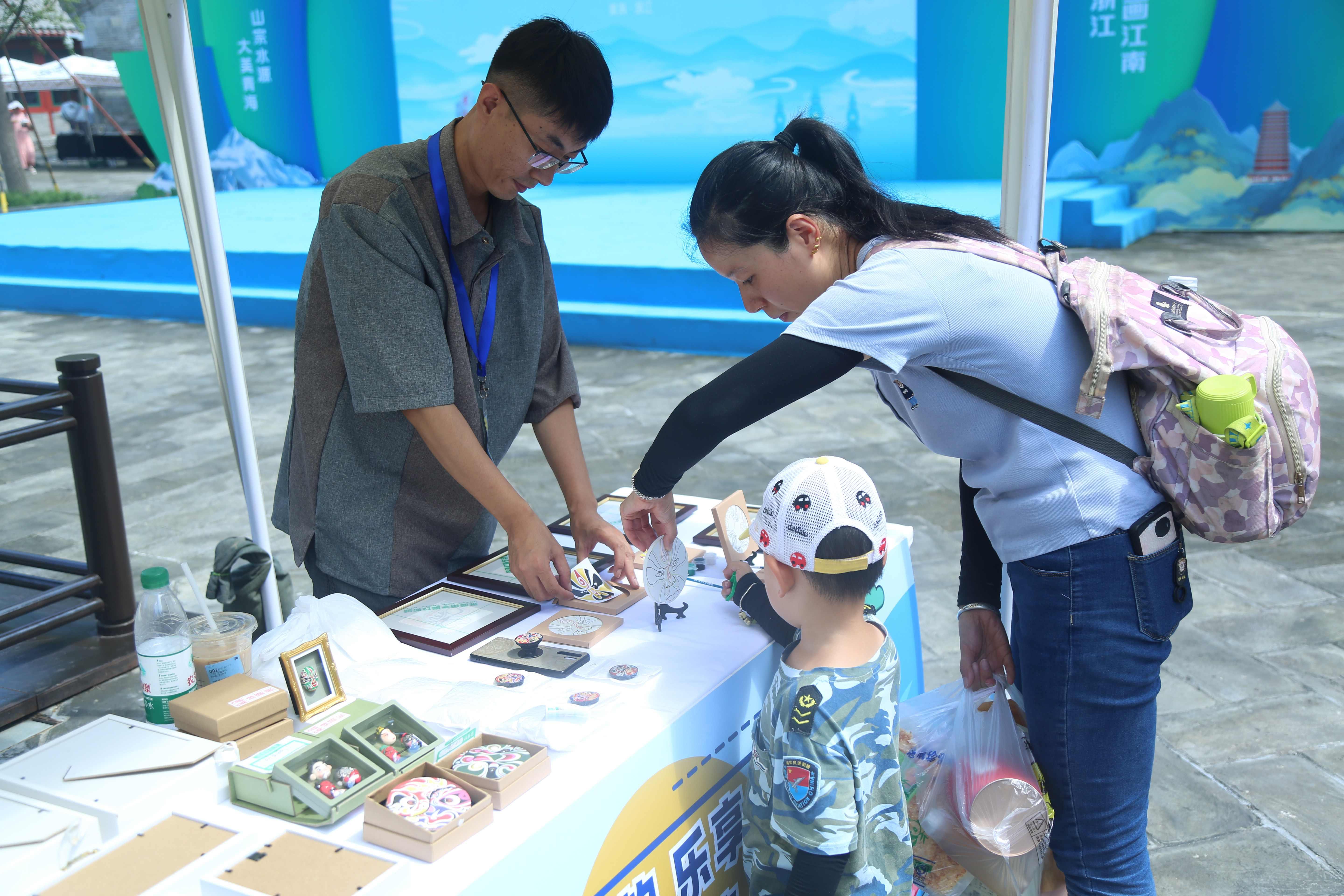 人们在“脸谱绘制”摊位前挑选纪念品。