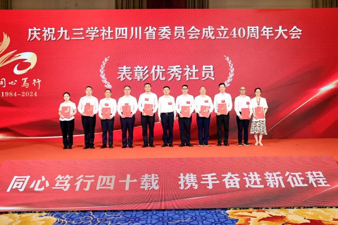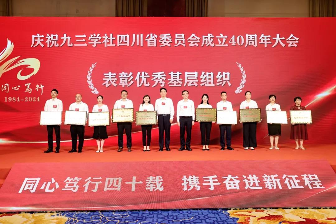 中共四川省委常委、统战部部长赵俊民和四川省政协副主席、九三学社四川省委主委杨丹为“九三学社四川省委员会成立40周年优秀基层组织”代表颁发奖牌。