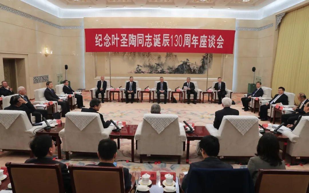 座谈会上,叶圣陶同志孙女叶小沫、曾孙女叶扬,叶圣陶研究会副会长、北京大学中文系教授商金林,开明出版社社长沈伟,人民教育出版社党委书记、社长黄强,商务印书馆党委书记、执行董事顾青,邬书林,王嘉毅先后发言。