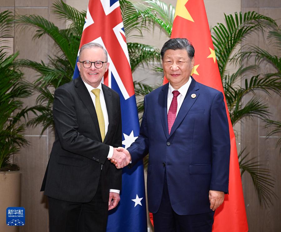 当地时间11月18日上午,国家主席习近平在里约热内卢出席二十国集团领导人峰会期间会见澳大利亚总理阿尔巴尼斯。新华社记者 张领 摄