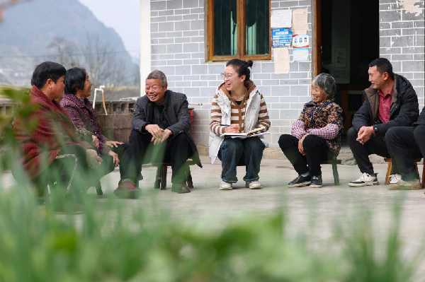 2024年3月9日,在贵州省岑巩县注溪镇周坪村,驻村干部(中)走访群众。新华社发(胡攀学 摄)