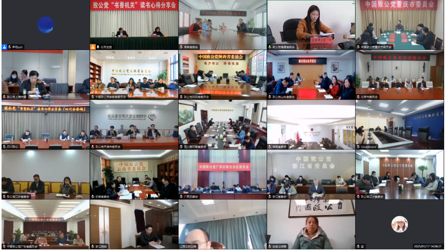 1月17日下午,致公党中央以线下会议加线上视频相结合的方式召开《伟大的政治创造——中国新型政党制度》一书读书心得分享会,致公党中央机关设主会场,各省级组织机关设分会场。致公党中央常务副主席张恩迪出席会议并讲话,副主席吕彩霞主持分享会。