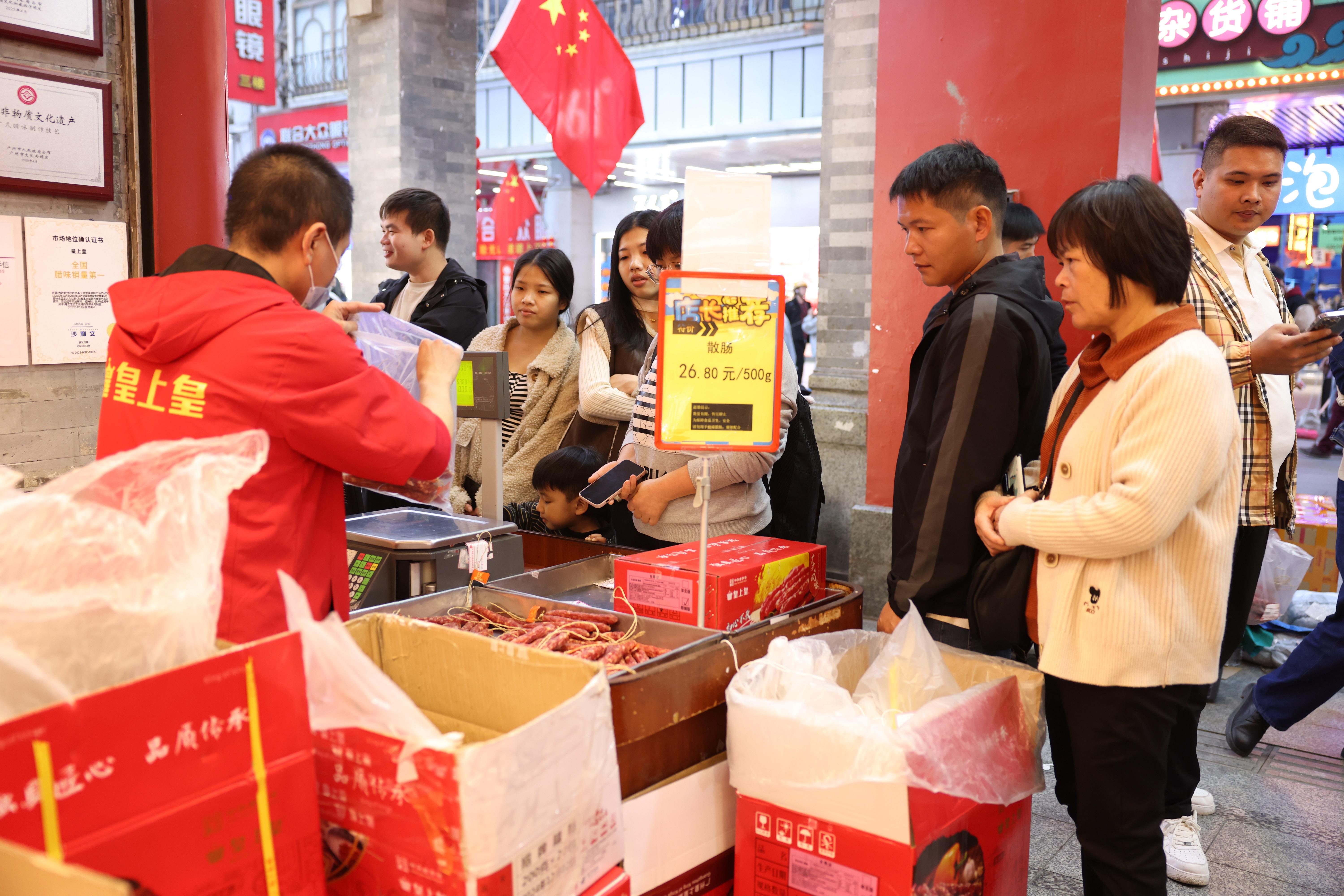 图为顾客正在位于上下九步行街的店铺内置办年货腊肠。