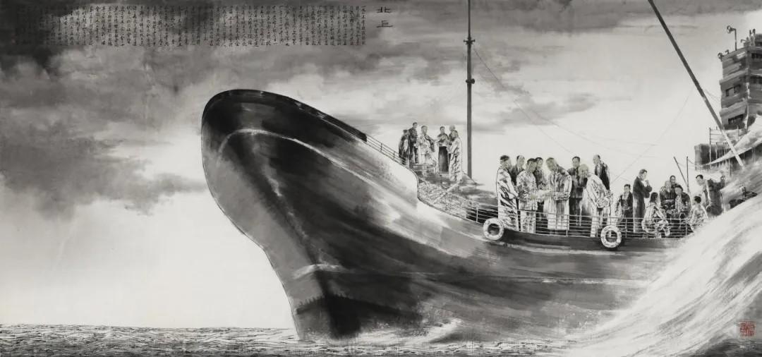孔维克的《北上》就是这类主题性书画作品的代表。1949年1月7日,李济深等民主人士乘坐轮船由香港北上登陆大连,并转道沈阳奔赴北京参与协商建国,这是民革党史上的一个重大事件,但美术界长期无人画过这一题材。2023年,为纪念中共中央颁布“五一口号”75周年,受民革中央主要领导同志委托,民革中央画院院长孔维克专门去大连搜集资料,精心创作了《北上》这幅画。该作以一艘奋力冲破黑暗的船为主要意象,并艺术性地将“北上”中的关键人物(八个民主党派的主要人物)以及历史记载中的重要细节浓缩在一艘船上,象征着民主党派与中国共产党“风雨同舟”、奔向光明。该画在第三届“风雨同舟”民革全国书画作品展展出时获得良好反响,诸多专家学者纷纷在画前驻足良久并高度评价。最终这幅画被民革中央收藏。