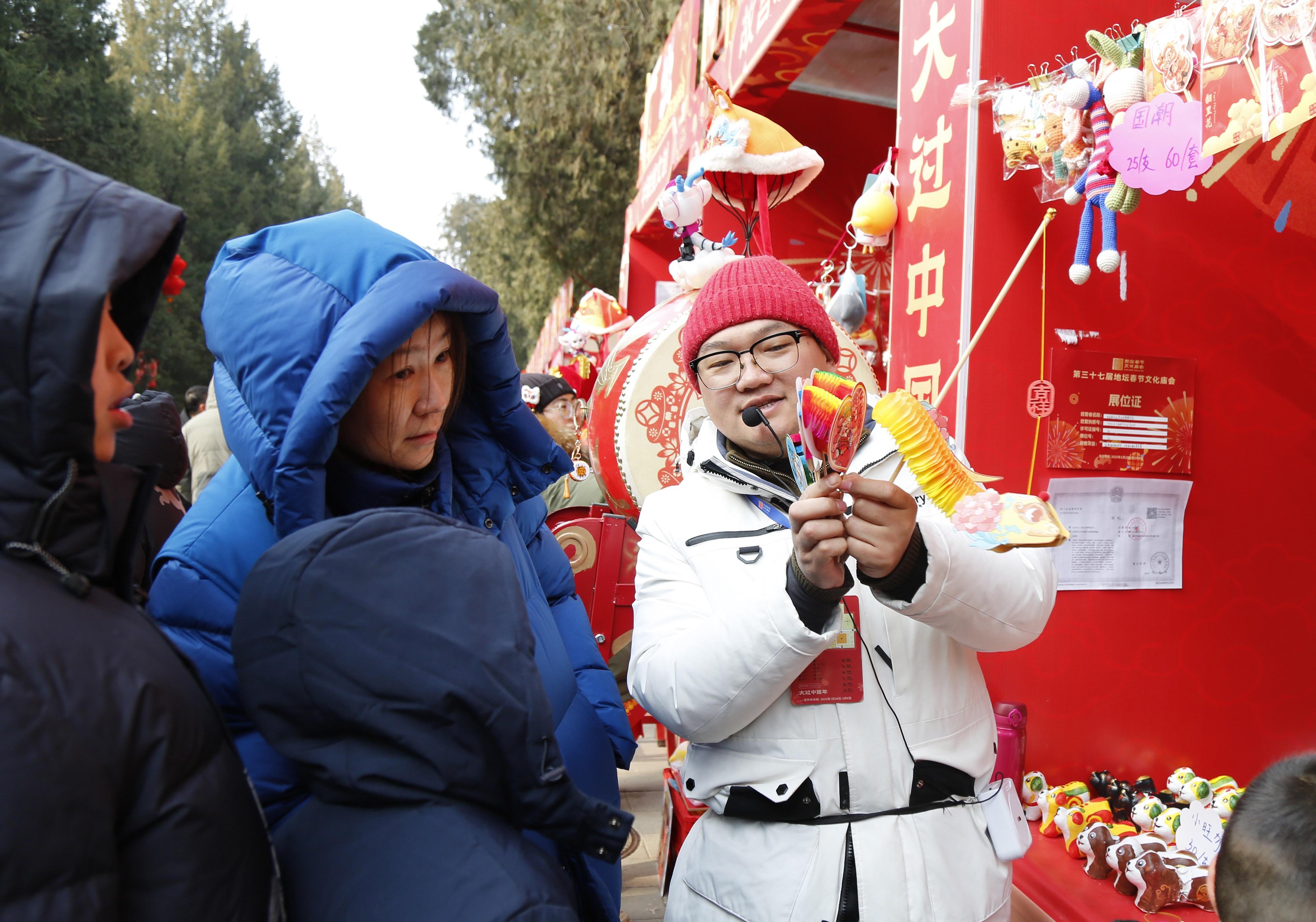 春节期间,以“大过中国年 喜迎四海春”为主题的第三十七届北京地坛春节文化庙会吸引众多游客前来参观游览。本届庙会将全国各地的年俗文化汇集其中,突出“中国年”特色。图为1月31日,在民俗文创展示摊位上,工作人员正在向游客介绍纸艺“翻花”。(记者赵亮摄)