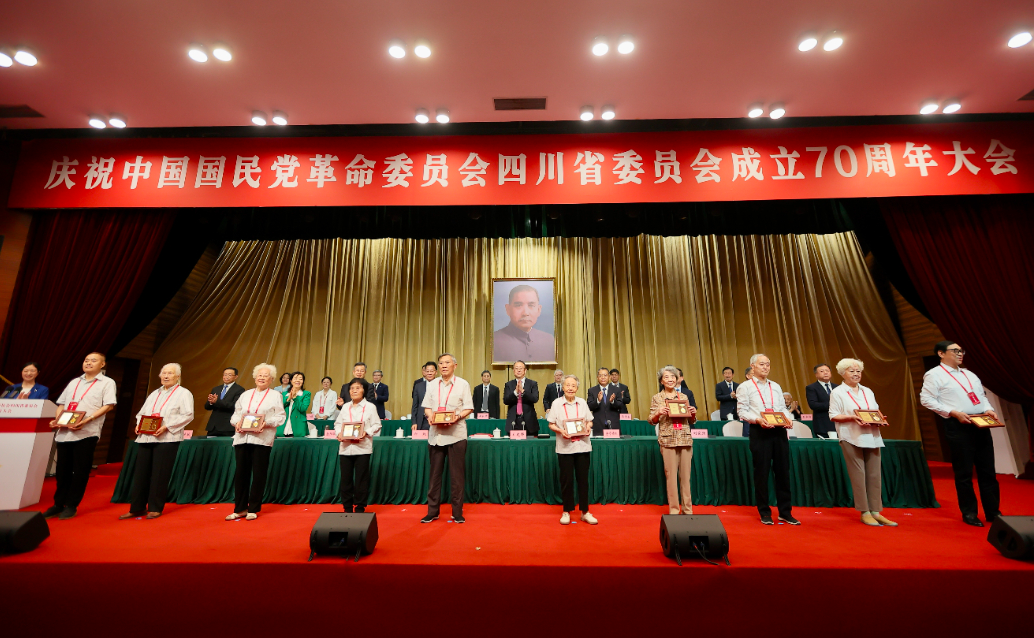 纪念大会上,郑建邦为民革党龄40年以上的老党员及“光荣在党70年”代表颁发纪念章,与会人员还共同观看民革四川省委会成立70周年主题片。