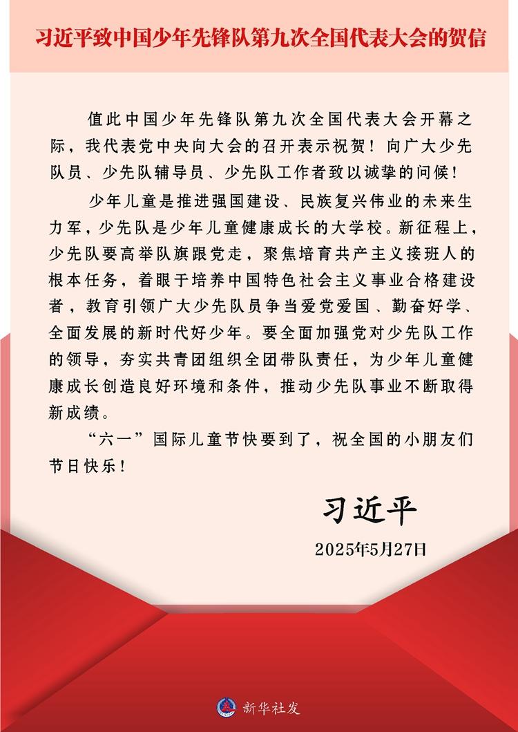 新华社北京5月27日电 “六一”国际儿童节即将到来之际,中国少年先锋队第九次全国代表大会27日上午在京开幕。中共中央总书记、国家主席、中央军委主席习近平发来贺信,代表党中央向大会的召开表示祝贺,向广大少先队员、少先队辅导员、少先队工作者致以诚挚的问候,并祝全国的小朋友们节日快乐。