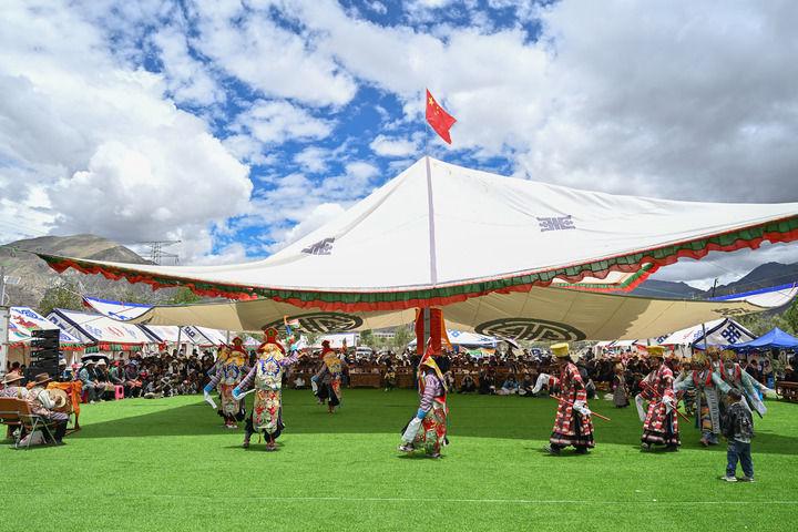 民间藏戏表演队在西藏南木林县非遗公园内表演湘巴藏戏(2025年7月16日摄)。新华社记者 李鑫 摄
