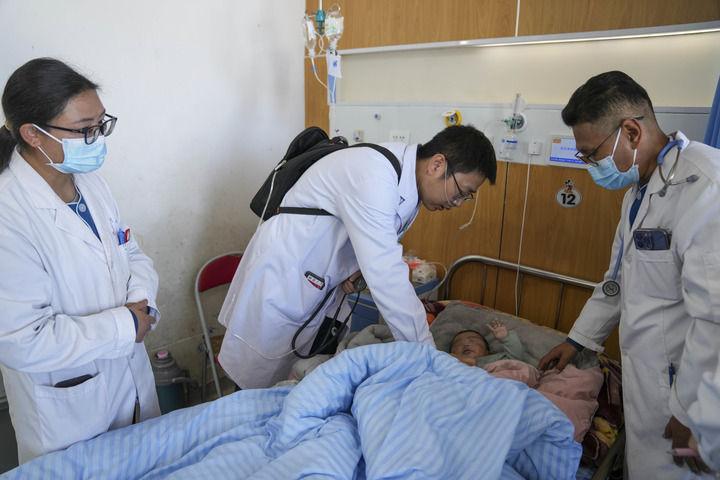 来自大连医科大学附属第一医院的援藏医生田聪亮(左二)和同事在西藏那曲市人民医院查房(2025年7月18日摄)。新华社记者 晋美多吉 摄