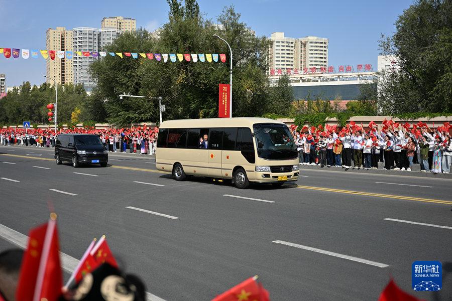 9月23日下午,中共中央总书记、国家主席、中央军委主席习近平率中央代表团乘专机抵达乌鲁木齐,出席新疆维吾尔自治区成立70周年庆祝活动。这是从机场到住地途中,习近平向沿途欢迎的群众挥手致意。新华社记者 辛悦卫 摄