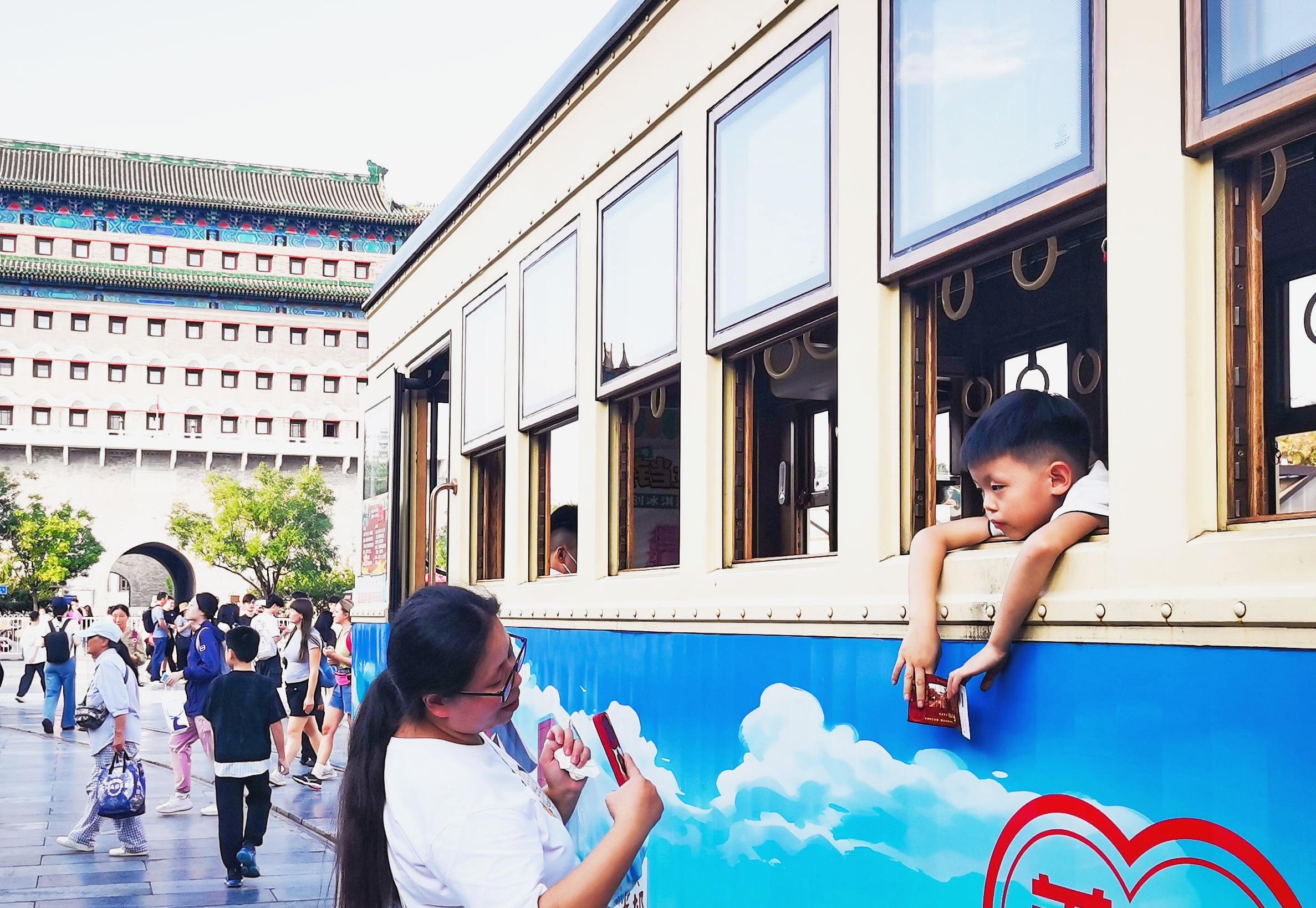 10月2日,游客在北京市前门大街体验铛铛车。本报记者 靳祖保 摄