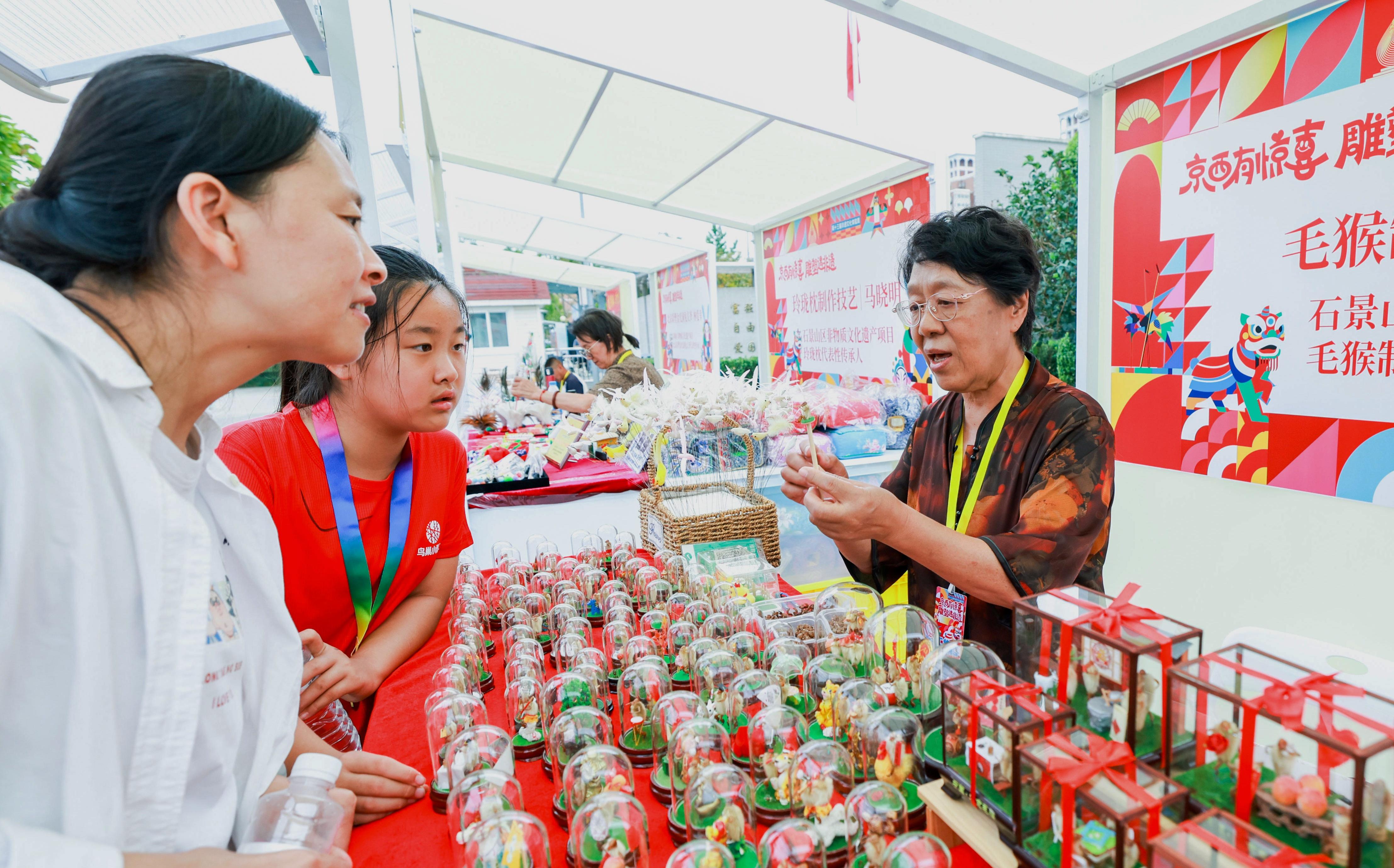 10月1日,游客在北京市石景山区北京国际雕塑公园体验毛猴制作技艺。本报记者 靳祖保 摄