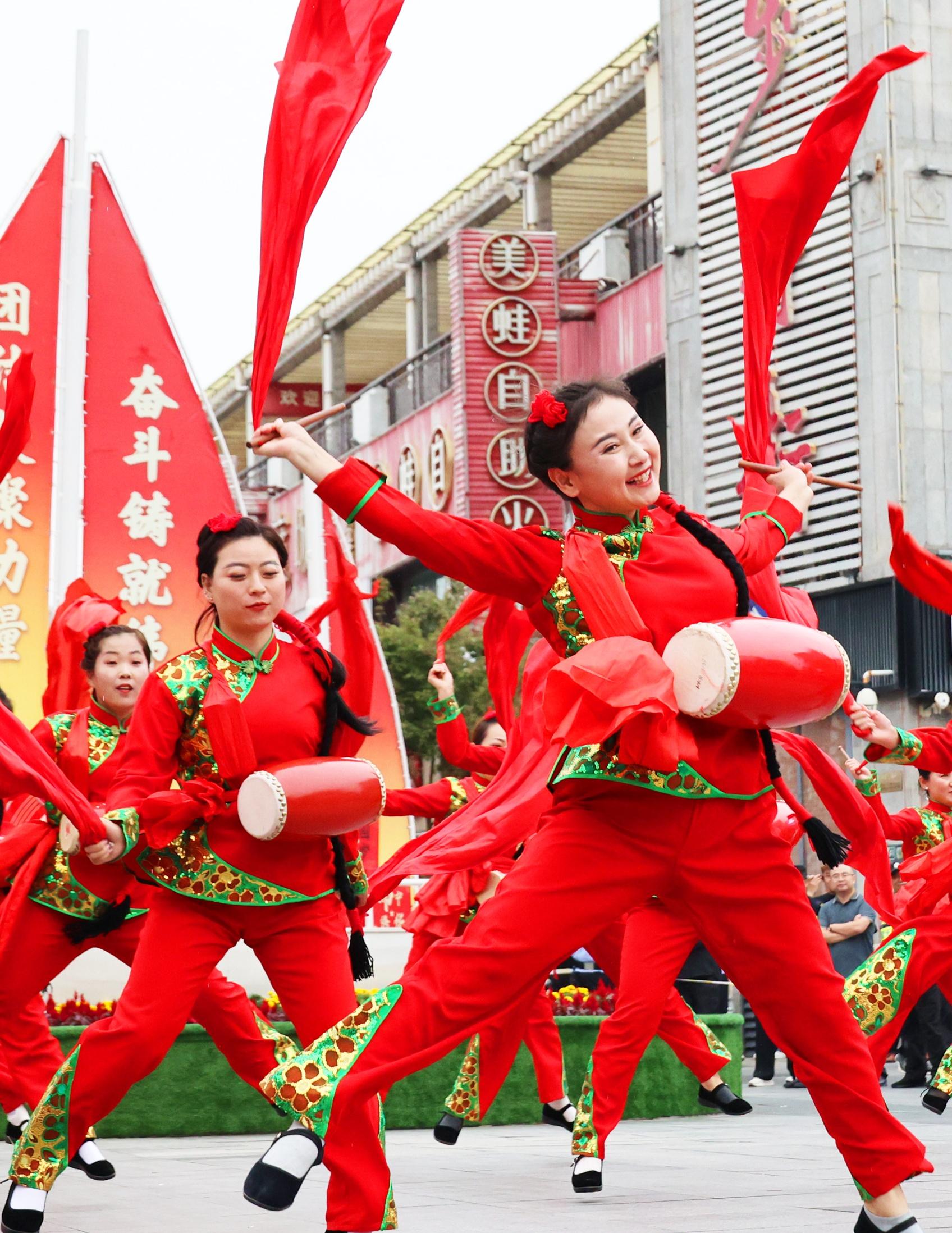 10月1日,在江苏省连云港市陇海步行街,舞者在表演安塞腰鼓。耿玉和 摄