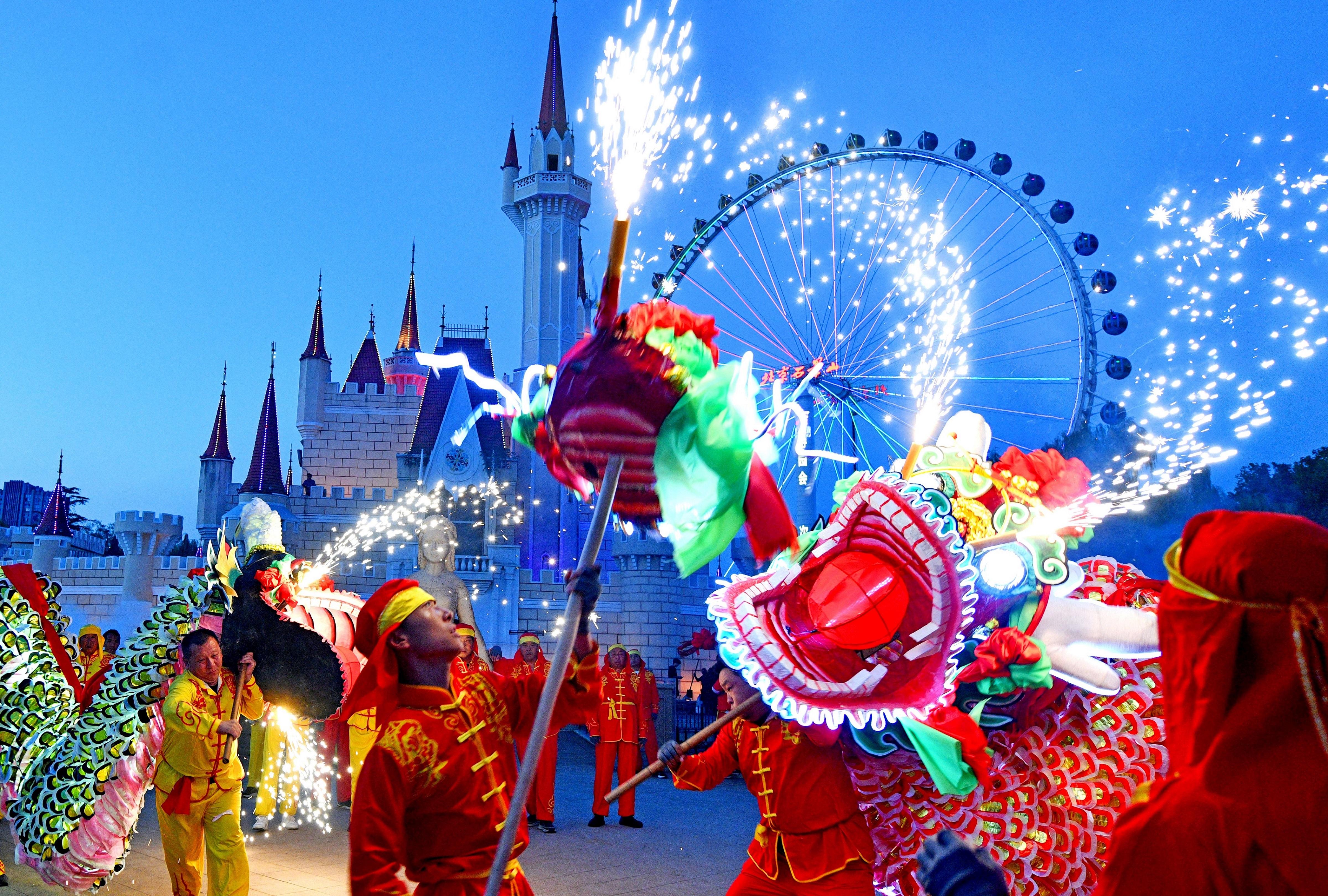10月3日,在北京石景山游乐园,陵川平城纸龙实景演出闪耀登场。民建会员 李文明 摄